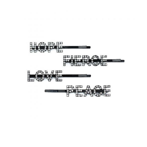 Black hair pins with rhinestone words.