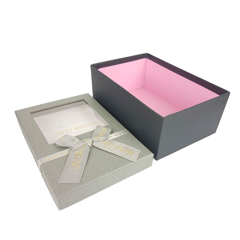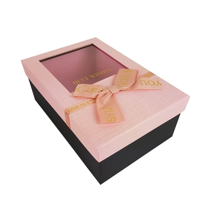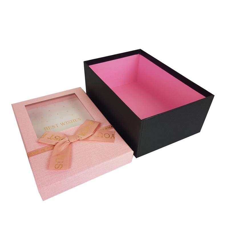 Black window gift box with a pink lid adorned with a pink satin ribbon gift bow. Very thick quality cardboard gift box with pink interior. Gift box for beauty products.